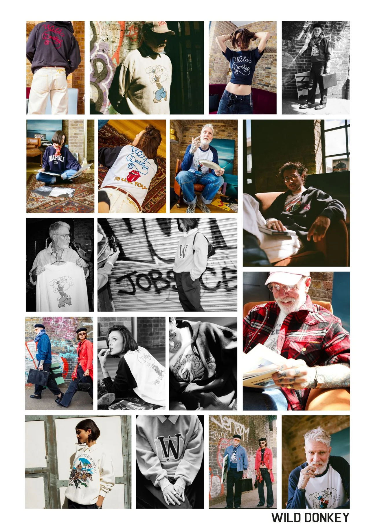와일드동키는 이탈리아의 유명 패션 컨설턴트 알레산드로 스콰르치(Alessandro Squarzi)에 의해 탄생했습니다. 그는 1950~70년대 미국의 컬리지웨어와 밀리터리웨어에서 영감을 받아, 그 시대의 자유롭고 반항적인 분위기를 현대적으로 재해석한 브랜드를 만들고자 했습니다. 빈티지한 무드에 유머러스한 그래픽을 더해, 단순한 복고가 아닌 ‘재미있는 복고’를 추구하는 것이 와일드동키의 핵심 철학입니다.